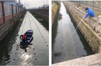 利港中心河現(xiàn)場維護GkO新型光催化網(wǎng)_水庫治理_河道治理_水生態(tài)修復_水環(huán)境治理與修復_江蘇雙良環(huán)境科技有限公司