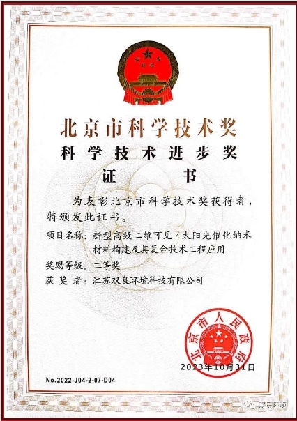 近日,江蘇雙良環(huán)境科技有限公司參與的項目《新型高效二維可見/光催化納米材料構(gòu)建及其復(fù)合技術(shù)工程應(yīng)用》榮獲北京市科學(xué)技術(shù)進(jìn)步獎二等獎。