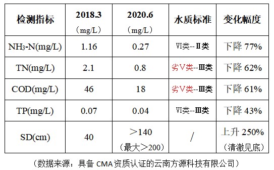 經(jīng)2018年5月至2020年5月兩年的治理及維護(hù),水生態(tài)系統(tǒng)健康穩(wěn)定發(fā)展。示范區(qū)內(nèi)水質(zhì)提升至III類水并維持穩(wěn)定達(dá)1年以上,“新型光催化技術(shù)”利用科技與自然共力,短期內(nèi)改善水質(zhì)指標(biāo),中長期生態(tài)恢復(fù)自愈自潔,真正實(shí)現(xiàn)清水穩(wěn)態(tài)。洱源西湖項(xiàng)目無論是水質(zhì)還是水生態(tài)都達(dá)到并超過設(shè)定的目標(biāo)和考核指標(biāo)。