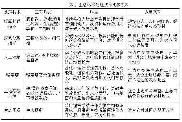 農村生活污水末端治理工藝可分為生物處理技術和生態(tài)處理技術兩大類。生物處理技術主要包括好氧生物處理和厭氧生物處理兩大類;生態(tài)處理技術主要包括人工濕地、穩(wěn)定塘、土地滲濾系統(tǒng)。生態(tài)廁所是基于過程控制應用的技術,其對黑水的后續(xù)處理起關鍵作用。生活污水處理技術具體的特點和適用范圍見表2。