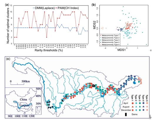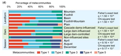 圖6 沿江優(yōu)勢(shì)群落組成。(a)對(duì)不同閾值采用兩種常用的分割方法的穩(wěn)定性。最佳族群的數(shù)目由Calinski-Harabasz指數(shù)和拉普拉斯近似法表明。(b)非計(jì)量多維標(biāo)度(NMDS)圖顯示了用DMM方法劃分的5種不同亞群落類型之間的區(qū)別。(c)長(zhǎng)江沿岸3個(gè)季節(jié)所有沉積物樣品的亞群落類型分布。(d)蒙特卡羅模擬的Fisher精確檢驗(yàn)和Chisquare檢驗(yàn)對(duì)群落類型與地貌類型、壩況類型和季節(jié)類型劃分之間的關(guān)聯(lián)性。Ka2新型光催化網(wǎng)_水庫(kù)治理_河道治理_水生態(tài)修復(fù)_水環(huán)境治理與修復(fù)_江蘇雙良環(huán)境科技有限公司