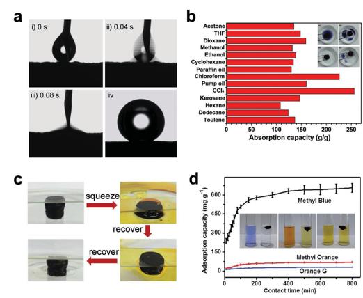 Ka2新型光催化網(wǎng)_水庫(kù)治理_河道治理_水生態(tài)修復(fù)_水環(huán)境治理與修復(fù)_江蘇雙良環(huán)境科技有限公司圖1 a)3D石墨烯氣凝膠作為吸附劑,用于從水中去除有機(jī)污染物。 a-i-aiii)一滴十六烷的吸收過(guò)程的視頻快照,以及a-iv)石墨烯氣凝膠表面上的水滴的光學(xué)照片。b)石墨烯氣凝膠對(duì)不同有機(jī)溶劑的吸收能力。 c)吸附/解吸循環(huán)顯示石墨烯氣凝膠對(duì)正己烷具有極好的可回收性。 d)不同染料的石墨烯氣凝膠的吸收能力。