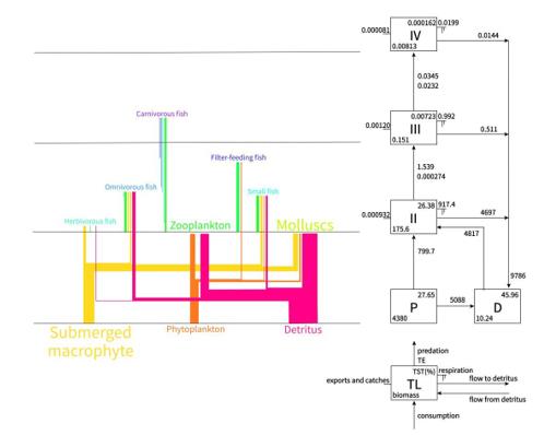iyw新型光催化網(wǎng)_水庫(kù)治理_河道治理_水生態(tài)修復(fù)_水環(huán)境治理與修復(fù)_江蘇雙良環(huán)境科技有限公司 圖5:經(jīng)濟(jì)大同湖食物網(wǎng)的流程圖(左)和林德曼脊椎(右)。不同的顏色對(duì)應(yīng)不同的官能團(tuán),每條線段的粗細(xì)表示相對(duì)能量流,字體大小表示相對(duì)生物量。P:生產(chǎn)者;D:碎屑;TL:營(yíng)養(yǎng)級(jí);TST (%):系統(tǒng)總吞吐量(%);TE:轉(zhuǎn)移效率。