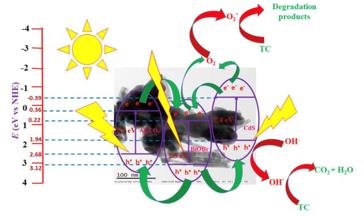 2·−起著關(guān)鍵作用。此外,由于其組分之間的協(xié)同作用,催化劑在可重復(fù)使用性和穩(wěn)定性測(cè)試中表現(xiàn)出良好的性能。在詳細(xì)分析的基礎(chǔ)上,提出了ABC復(fù)合材料中TC的降解機(jī)理。本研究將提供一種高效且可回收的光催化劑,用于去除抗生素水污染物。