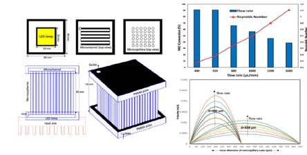 3reactor.day.kW,揭示了工藝強(qiáng)化對(duì) MO 光催化降解效率的積極影響。在所制備的強(qiáng)化微光反應(yīng)器、所研究的間歇式光反應(yīng)器和管流光反應(yīng)器中,鉬的降解百分比分別為90.83%、58.6%和65.33%。對(duì)微毛細(xì)管長(zhǎng)度(30,45,60 mm)和直徑(400,850μm)的影響的研究表明,鉬轉(zhuǎn)化率從94.19%(30 mm長(zhǎng),850μm直徑)下降到58.01%(45 mm長(zhǎng),400μm直徑),因?yàn)楦鶕?jù)激光分析和 COMSOL 模擬,管子變窄和伸長(zhǎng),導(dǎo)致光子損失、壓降和管內(nèi)湍流增加。