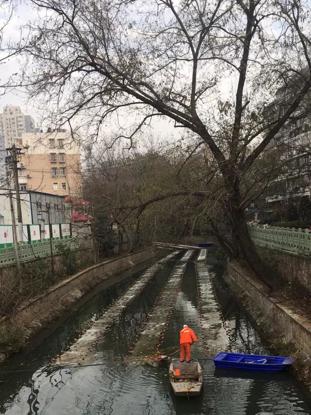 2017年12月21日,內(nèi)秦淮河中段,施工人員在實(shí)施石墨烯光催化網(wǎng)的鋪設(shè)。2gk新型光催化網(wǎng)_水庫(kù)治理_河道治理_水生態(tài)修復(fù)_水環(huán)境治理與修復(fù)_江蘇雙良環(huán)境科技有限公司